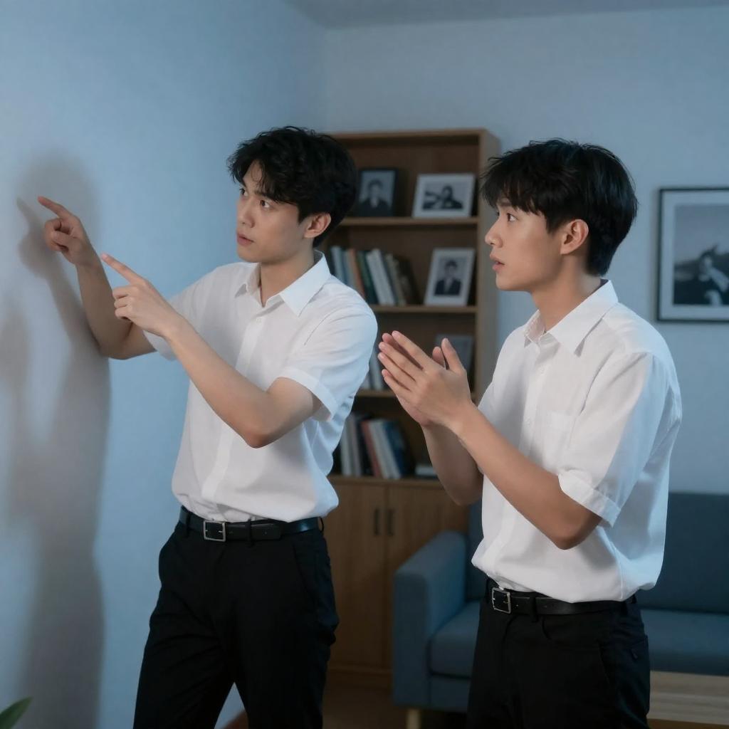 Two people in a blue-lit room, both wearing white shirts and black pants. One points at a wall, the other gestures with hands. Bookshelves, framed photos, and a couch in the background. Intense expressions on both faces.