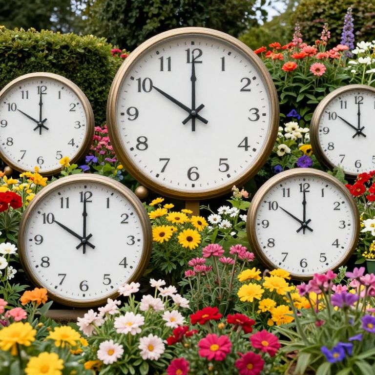 Photograph of six large, round, white clock faces with black numerals and hands, surrounded by a vibrant garden of colorful flowers including yellow daisies, red poppies, pink zinnias, and purple delphiniums. The clocks are positioned at varying angles, with three in the foreground and three in the background. The garden is lush and densely packed, with green foliage creating a rich, natural backdrop. The clocks' gold rims contrast with the vivid flower colors, adding a touch of elegance to the lively scene. The background features a dark green hedge, adding depth to the image.