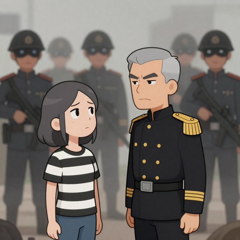 Cartoon-style drawing of an older man with gray hair and a black uniform with gold epaulettes, standing facing a younger woman with gray hair and a black-and-white striped shirt. Four masked soldiers with glowing eyes stand in the foggy background. The older man's expression is stern, the woman's is tense. Smoke and indistinct objects are in the background.