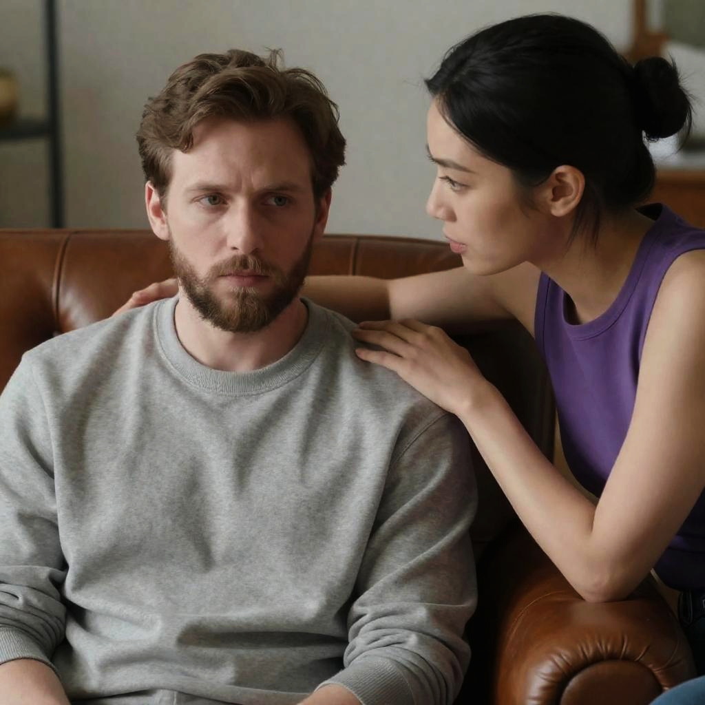 Photograph of a man with blond hair, beard, and light blue striped shirt leaning close to a woman with dark brown hair. Both looking at each other intently. Wooden shelves with various items in the background. Man on left, woman on right.