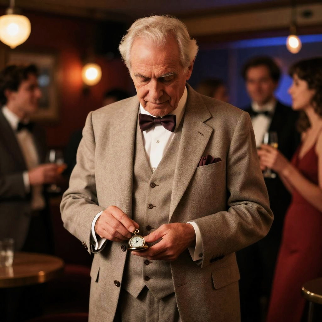 Elderly man with vintage three-piece suit with pocket watch enjoys a lively party in a cozy jazz club, surrounded by vibrant colors and soft shadows.