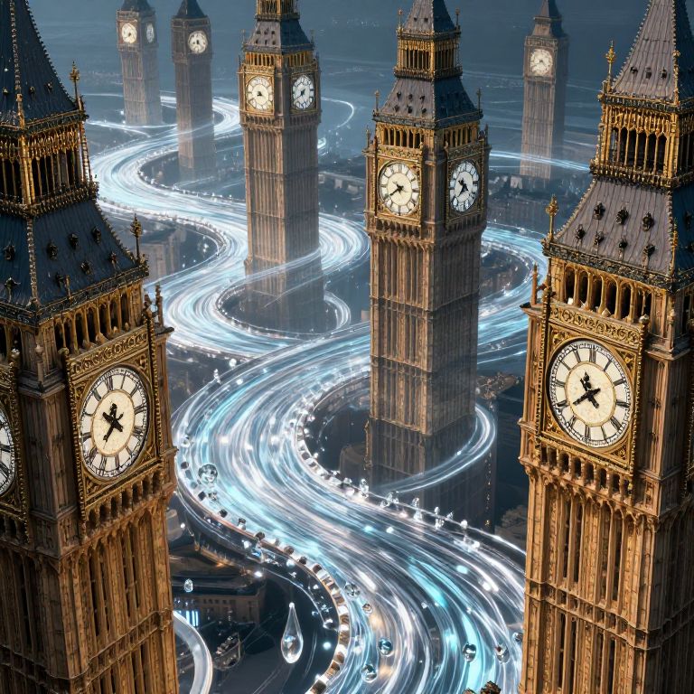 A surreal digital artwork depicts clock towers spiraling infinitely upward, their curved faces adorned with vintage-style clocks displaying various times, as crystalline rivers of light flow horizontally across the scene, creating a mesmerizing blend of fantasy and timelessness.