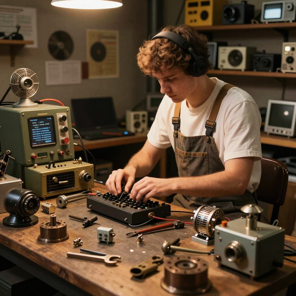 Gadget mechanic in a cluttered garage filled with innovative gadgets and mechanical parts, vintage tools mixed with futuristic technology, warm lighting and immersive detail