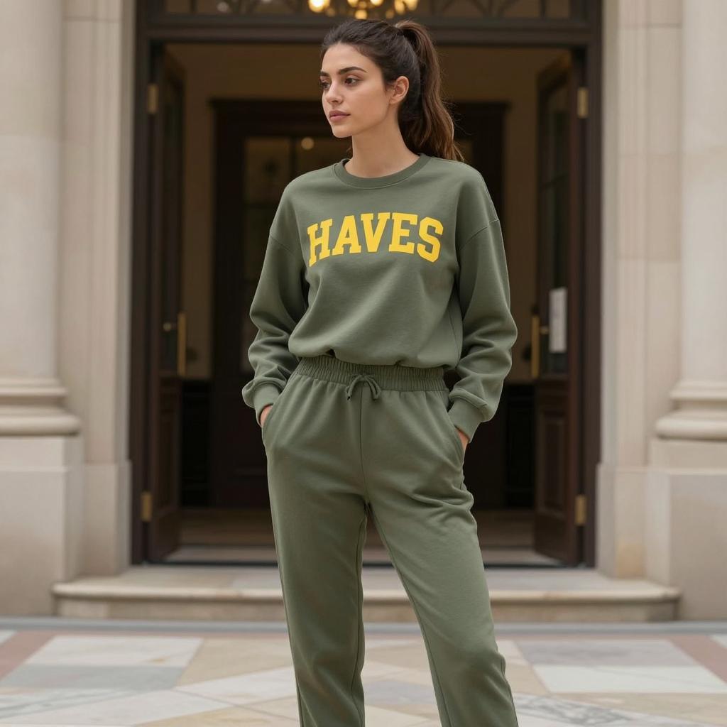 Young woman standing in front of an ornate building entrance wearing an olive green matching sweatpants and long-sleeve sweatshirt set with the word 'HAVES' printed in yellow. She has dark brown hair tied in a high ponytail and her hands are in the pockets of her pants. The background features classical architectural elements including a marble floor and warm tones, with soft natural lighting and realistic shadows.