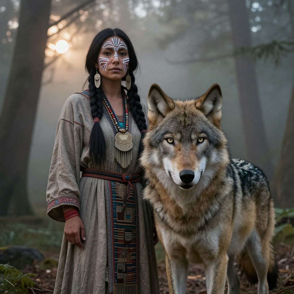 Beautiful native american woman and wolf standing together in a misty forest at dawn, intricate tribal face paint, flowing traditional garments, wolf with sharp, intelligent eyes, ethereal lighting, cinematic atmosphere, highly detailed, mystical connection between them.