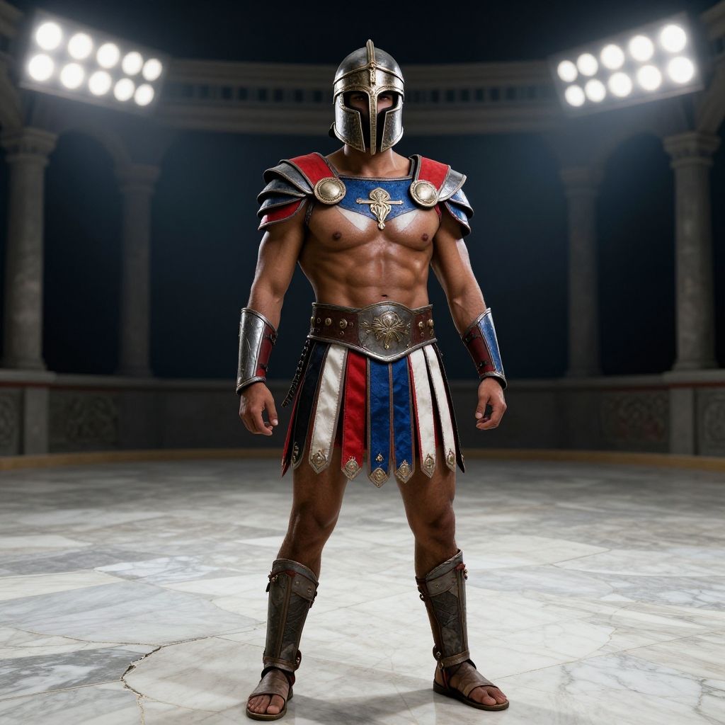 Photograph of five muscular, ancient Greek warriors in colorful armor, standing in front of a classical stone colonnade, holding swords and shields.