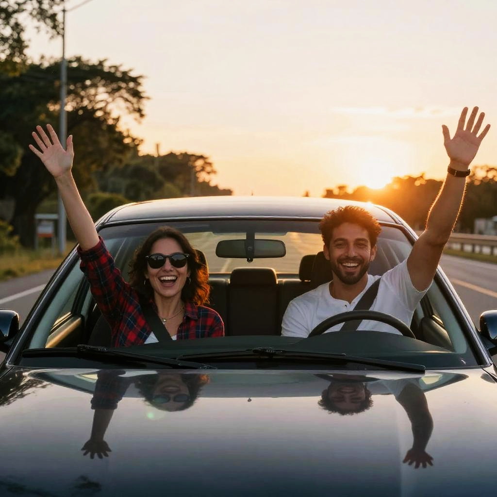 A candid photo shows the view from inside a car, focusing on two people's hands high-fiving through the sunroof. The person on the left is wearing a black wristwatch, while the person on the right is in blue jeans. The car's dashboard and steering wheel are visible, with a blurry outdoor scene and other cars in the background. The overall vibe is casual and joyful.