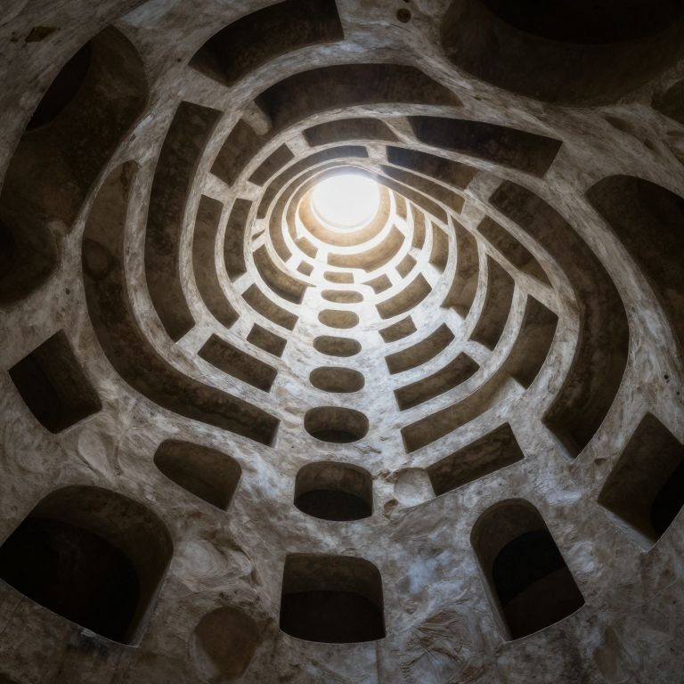 Photograph of a circular, spiral stone staircase viewed from below. The staircase features dark, rectangular steps and archways, arranged in concentric circles, creating a hypnotic pattern. The central light at the top of the spiral is bright white, contrasting with the dark, textured stone. The image has a high contrast, with shadows accentuating the stone's rough texture. The overall composition is symmetrical and geometric, with a sense of depth and movement. The style is minimalistic and abstract, focusing on the architectural form and light.