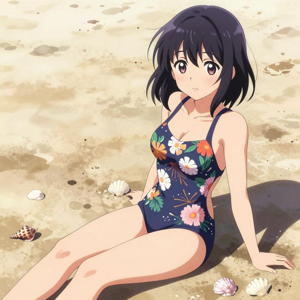 Summer beach anime girl sitting on shore, wearing a swimsuit with a floral pattern, sunlit skin, seashells around, detailed anime art style with soft shadows and vivid colors