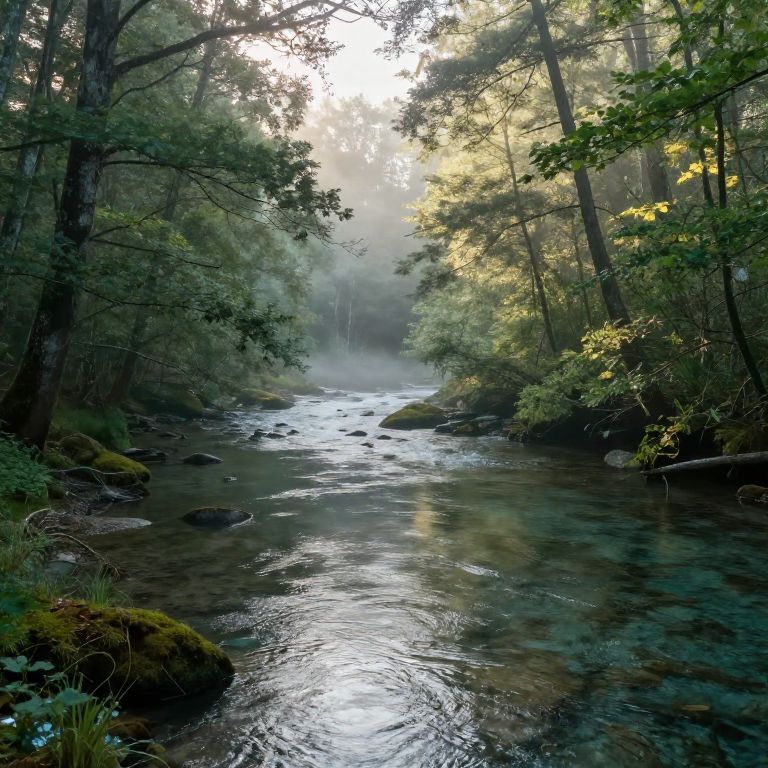 Photograph of a serene forest stream with clear, flowing water, surrounded by tall trees and dense green foliage, bathed in soft morning light filtering through