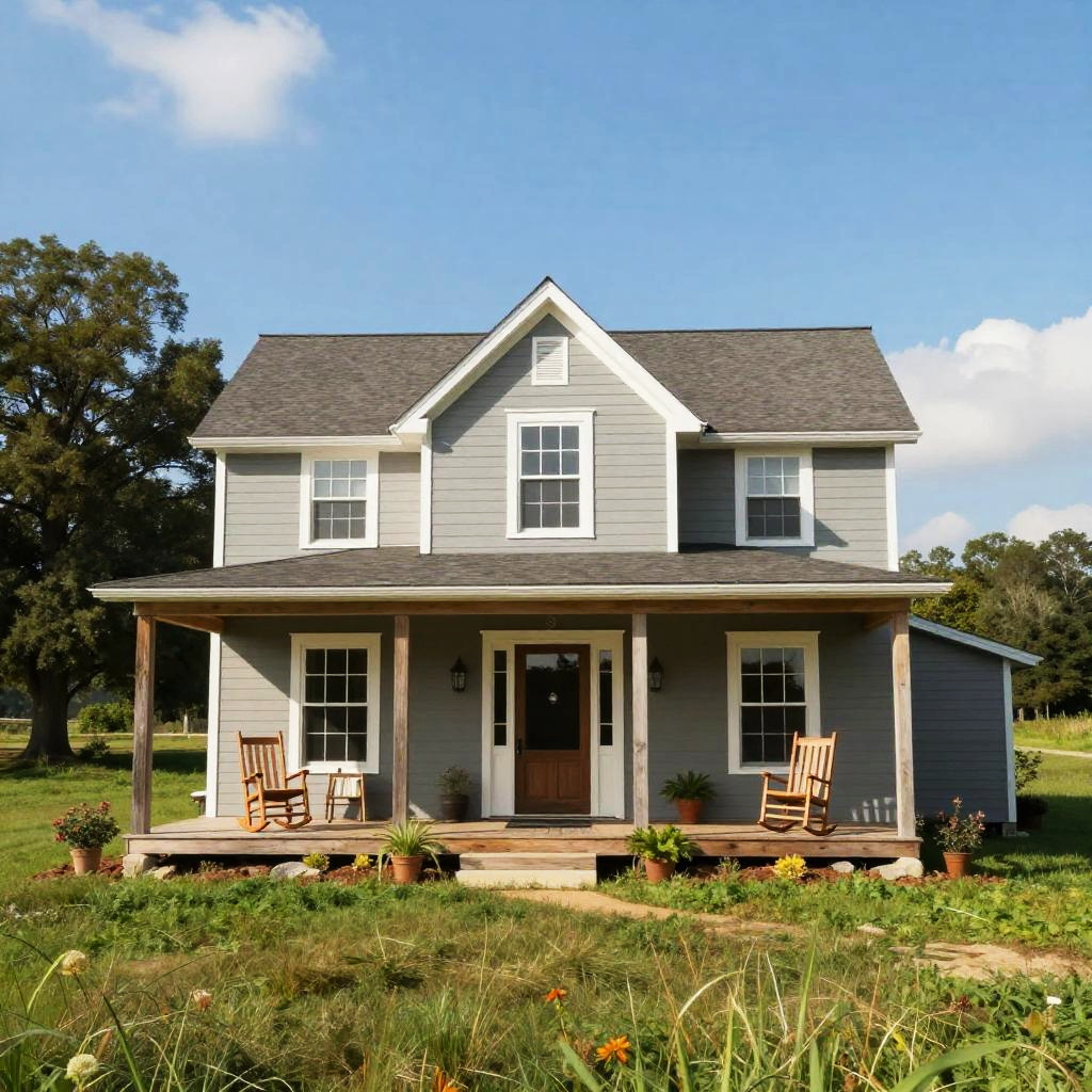 Grey ranch house surrounded by lush green fields under a bright blue sky, rustic wooden porch with rocking chairs, cozy and inviting countryside home style