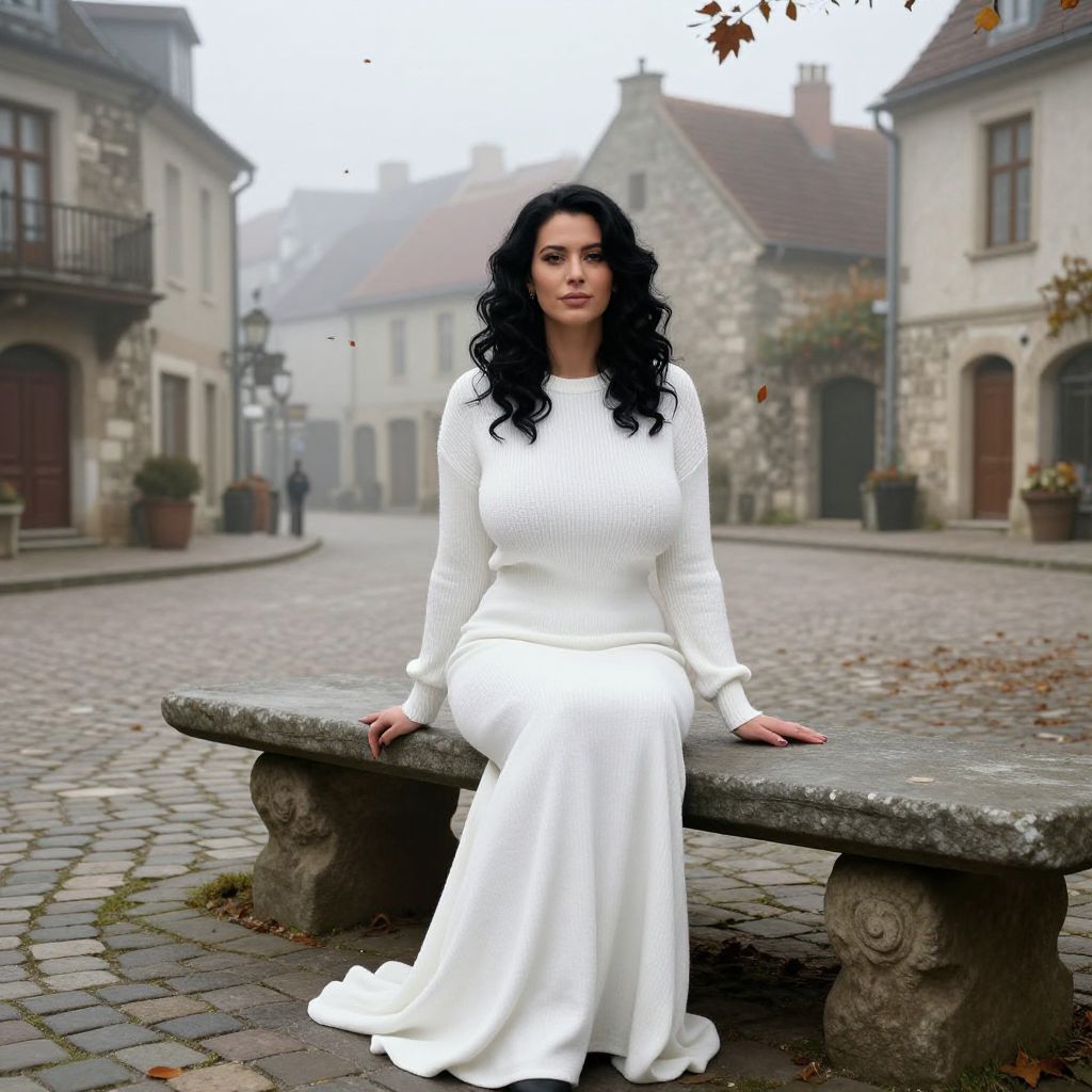 A tall, elegant woman with wavy black hair and a serene expression wearing a long white sweater dress as a costume, seated on a stone bench in a misty European village square, surrounded by cobblestone paths and old stone buildings with autumn leaves falling gently.. The woman has big tits and cute face