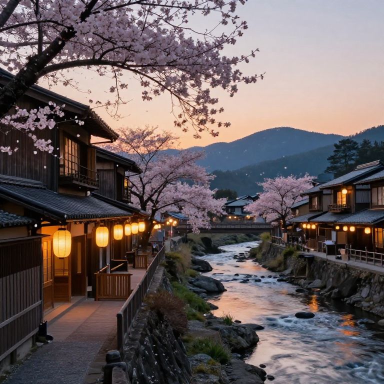 Japanise traditional village scene at sunset, wooden houses with paper lanterns glowing softly, cherry blossoms gently falling, serene river flowing nearby, mountains in the background, highly detailed, warm color palette