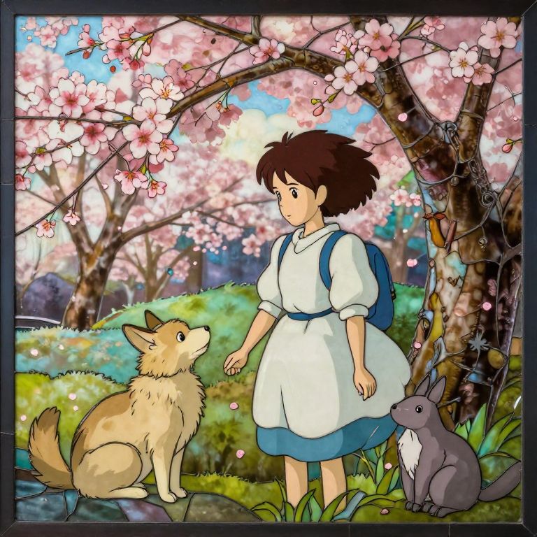 Ghibli stained glass depicting a young girl and her animal friends under cherry blossom trees, soft pastel colors blending in the glass, detailed textures highlighting the gentle nature and magical realism iconic to Studio Ghibli’s visual storytelling.