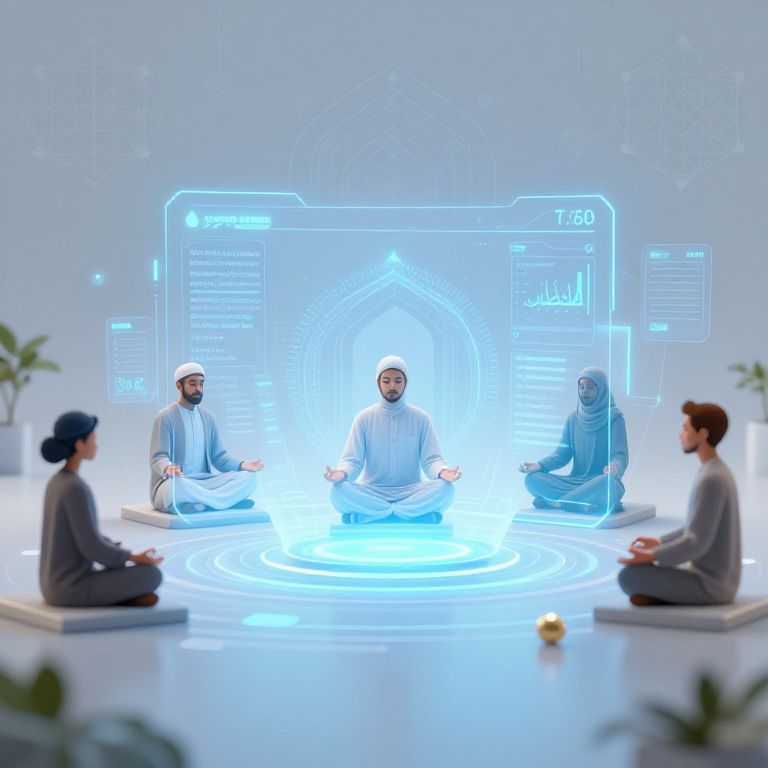 Islamic AI images prompt: A futuristic Islamic AI images prompt showing a scholar in traditional attire interacting with a holographic mosque, surrounded by dynamic geometric shapes and digital light, cyber-organic fusion, vibrant and balanced composition, ultra-detailed, artistic vision.
