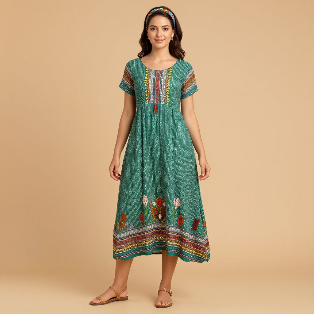 A woman is wearing a green dress with a colorful pattern on it. She has a headband on her head and is wearing sandals on her feet.