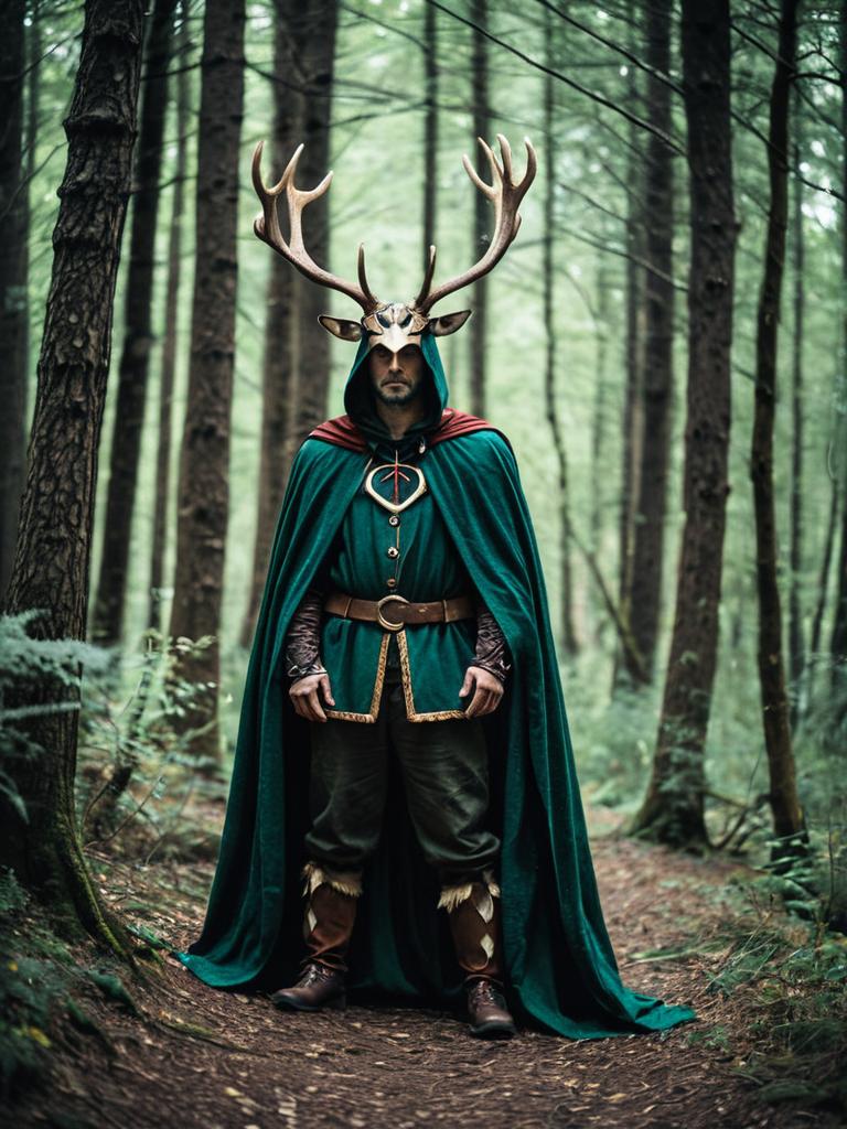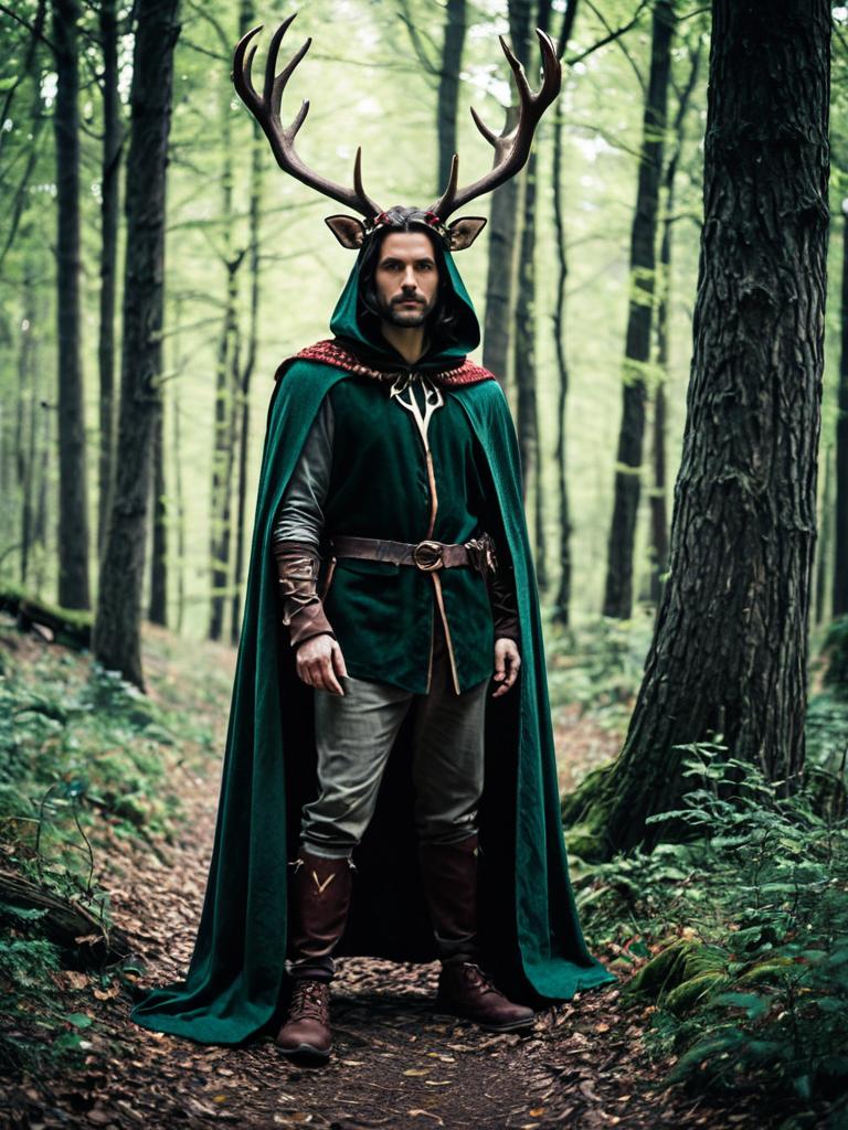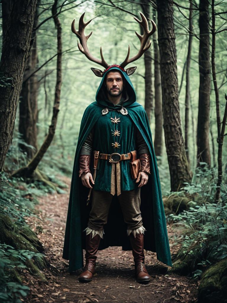Man in Enchanted Forest Costume, full-body cosplay photo with antlers and cloak