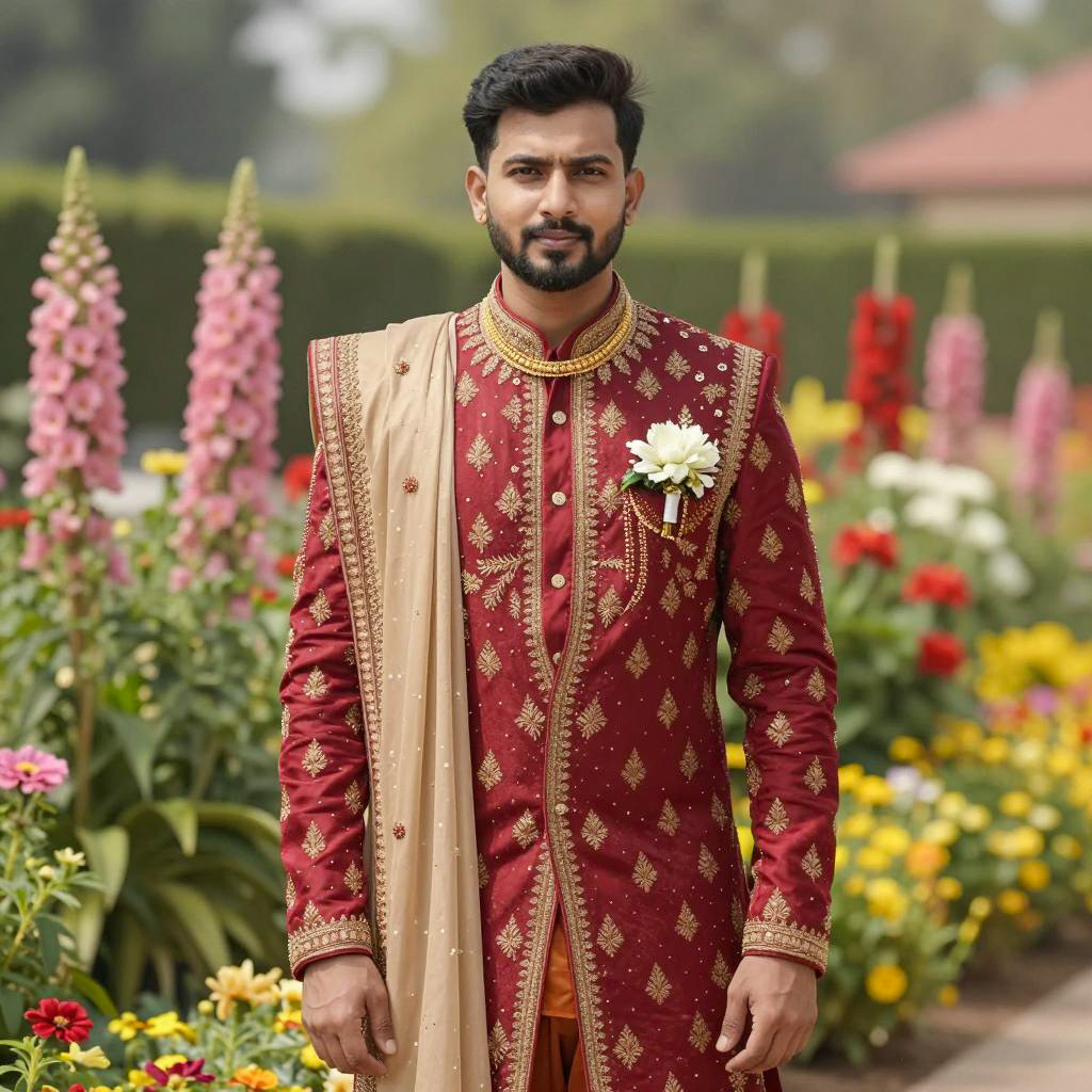 Groom accessories wedding, photorealistic, male model, standing in vibrant flower garden, traditional Indian attire, red sherwani with intricate gold embroidery, beige dupatta draped over shoulder, red button-up shirt underneath, gold necklace, white floral boutonniere, brown pants, short black hair, neatly trimmed beard, light brown skin, looking directly at camera, daytime, colorful flowers, tall pink and red blooms in background, lush green foliage, sunny, casual yet elegant, soft lighting, detailed ures