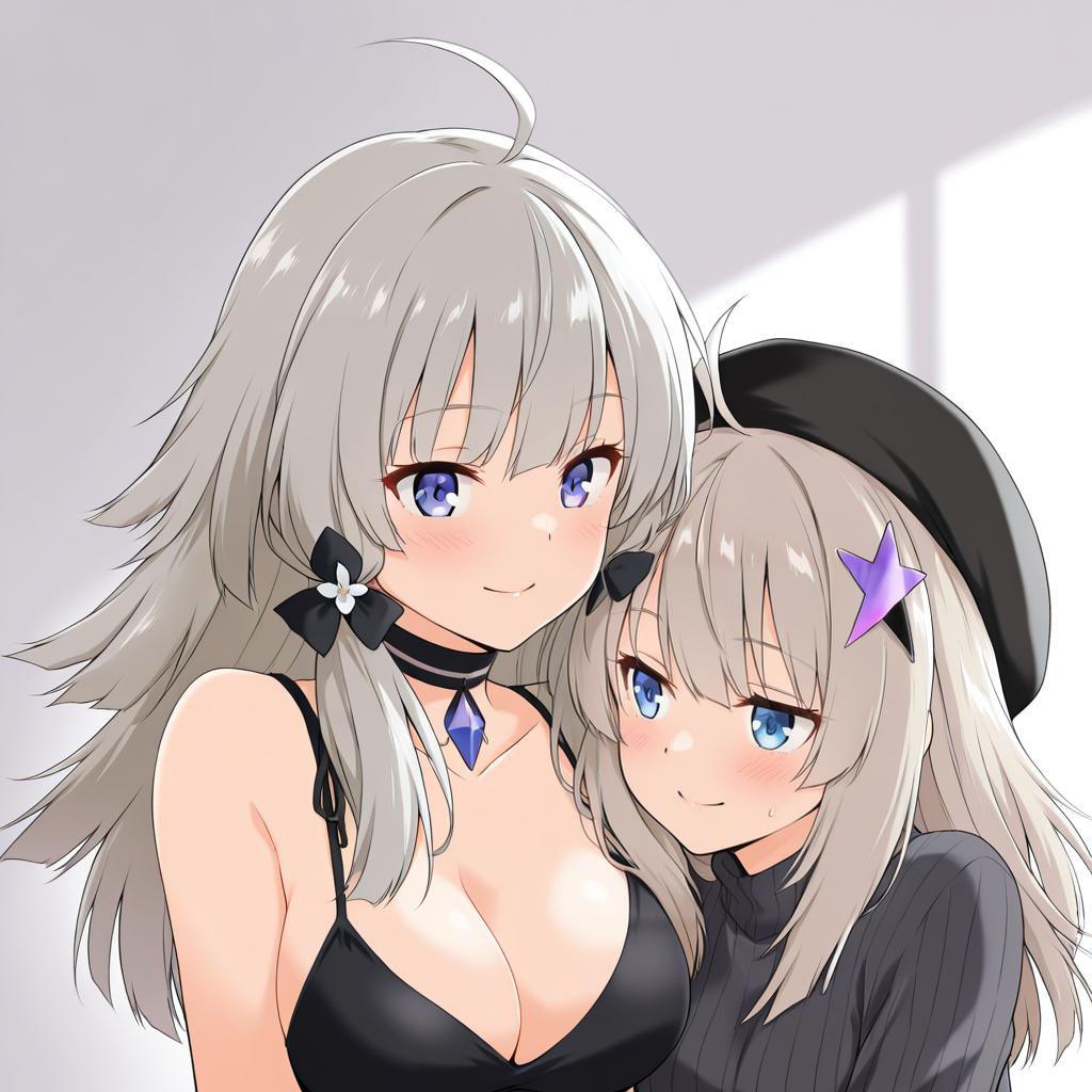 Aa-12 (girls' frontline), girls' frontline, 1girl, blue eyes, bags under eyes, long hair, grey hair, star hair ornament, ahoge, medium breasts, cleavage, black headwear, by artist felutiahime, illustrious