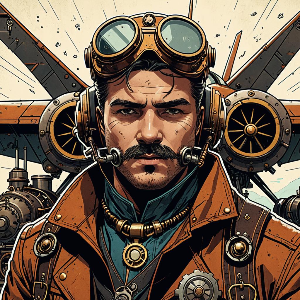 Cel-shaded, highly detailed portrait of a steampunk aviator ace wearing vintage aviation goggles and a brown leather jacket with mechanical details. The character features a mustache, dark hair, and a serious expression, set against a background of rusty mechanical wings and engines. The artwork is in a vintage comic book style with sharp focus and intricate rusty mechanical textures.
