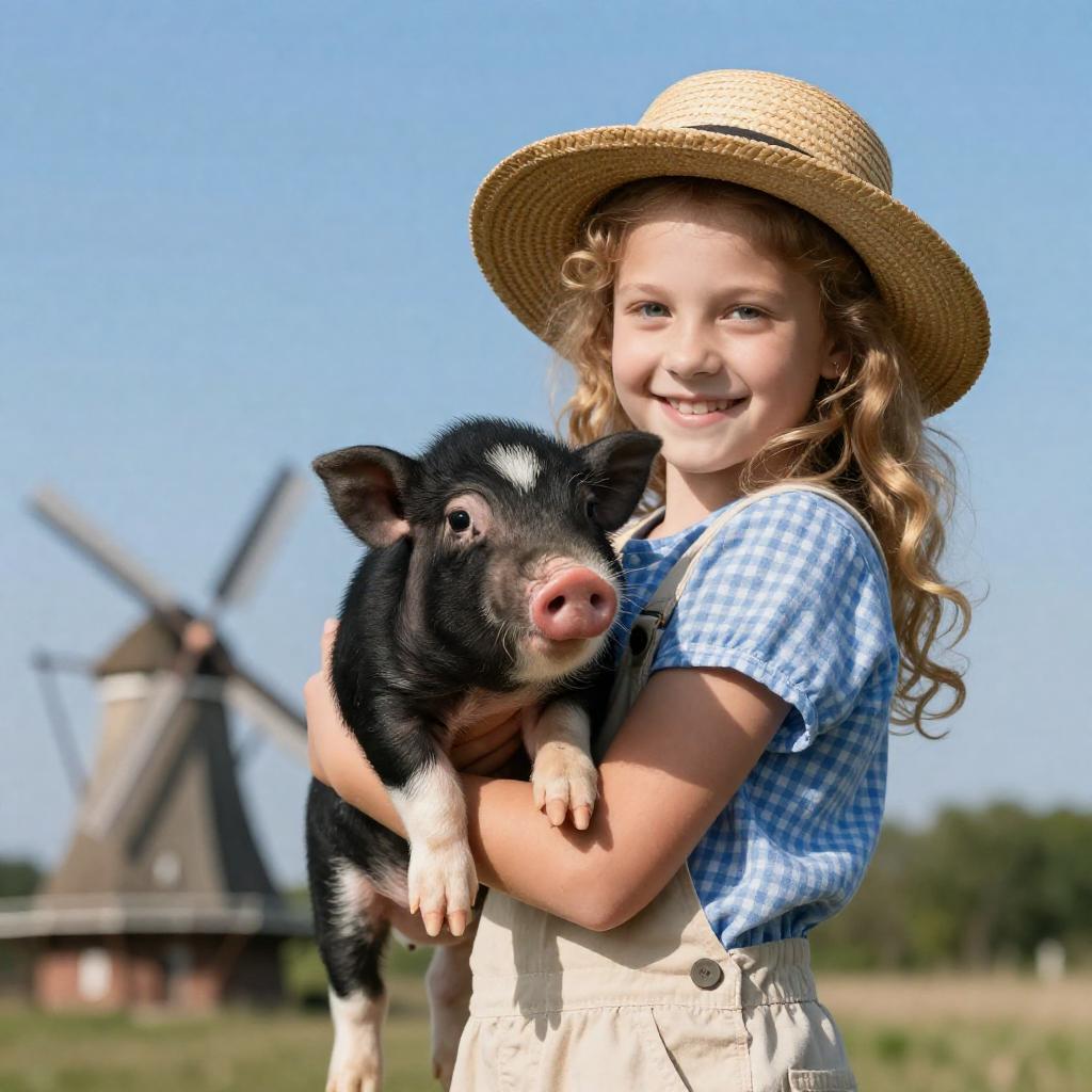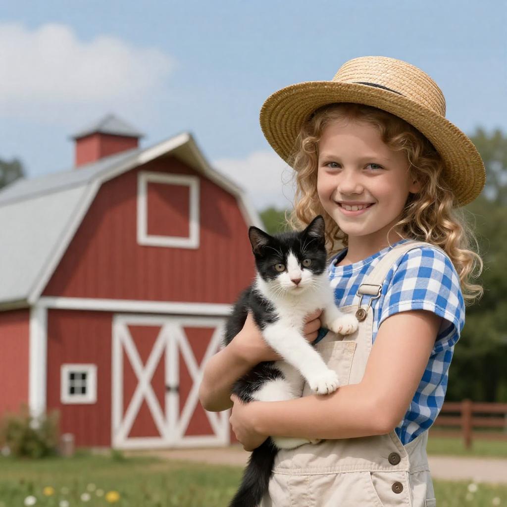 Photograph of a smiling young girl with curly blonde hair wearing a straw hat, blue and white checkered shirt, and beige overalls, holding a black and white kitten. Red barn with gray roof and green trees in the background. Clear blue sky with scattered clouds. Girl positioned on the right, barn on the left.