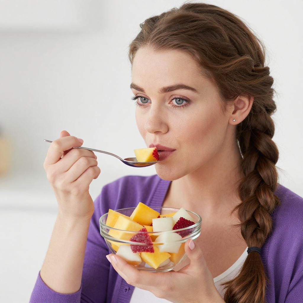 Photograph of a blonde woman from the shoulders down, wearing a white sleeveless top, holding a white bowl filled with colorful fruit (strawberries, grapes, and pineapple chunks). She's using a spoon to eat a mix of fruit. The lighting is bright and even, with a shallow depth of field, making the background blurred. The camera angle is slightly above eye level, focusing on the bowl and her hands.
