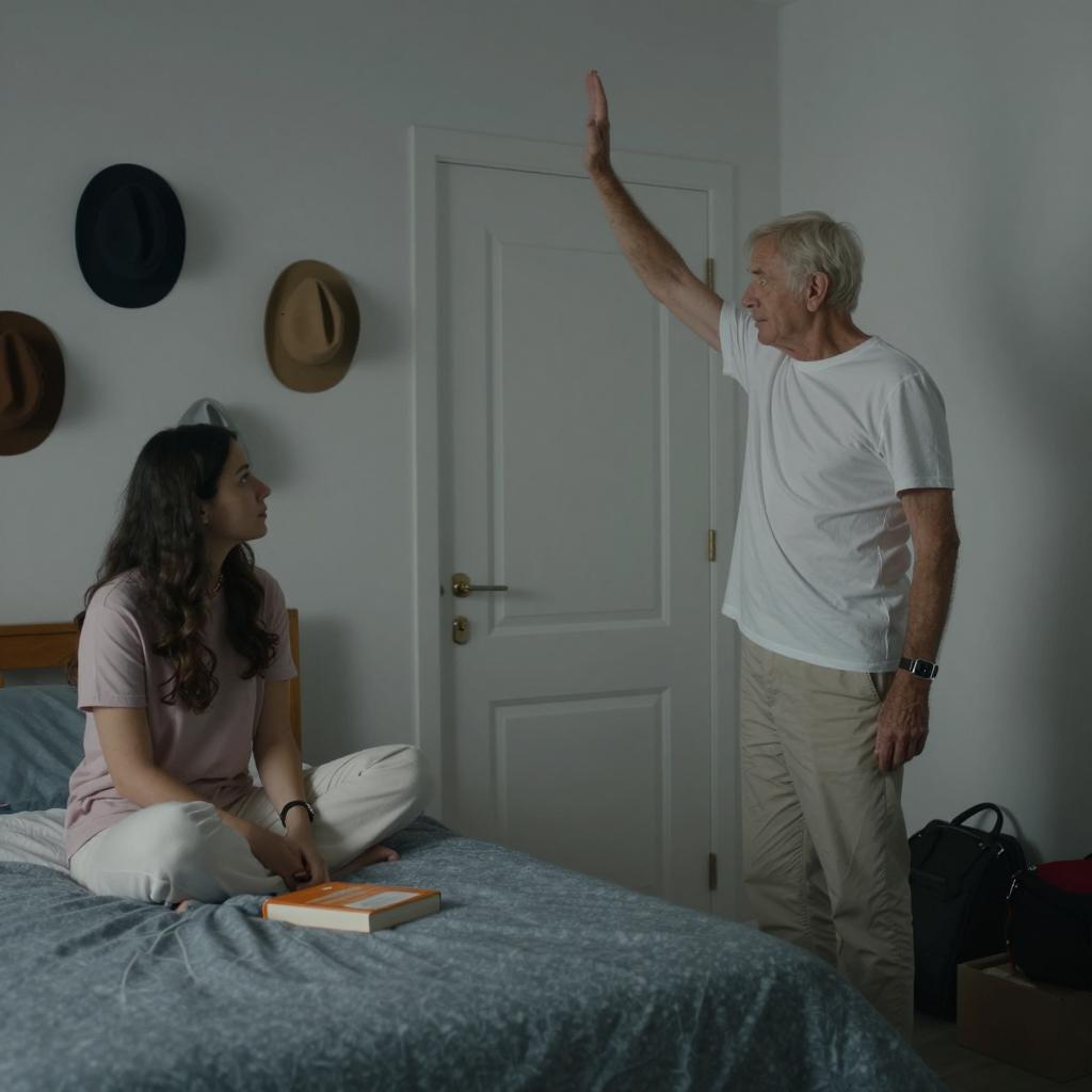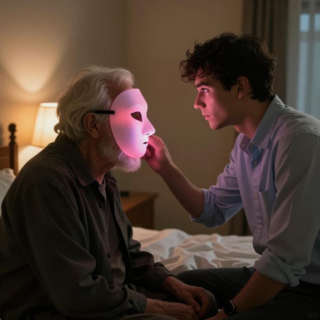 Old man with bald head, wearing white shirt and black vest, sits with eyes closed, resting head on hand. Dimly lit kitchen in background. Woman in red dress stands in doorway, facing another person with white mask. Table with glasses and books in foreground. Two people in background, one holding a drink. Low lighting, shadowy.
