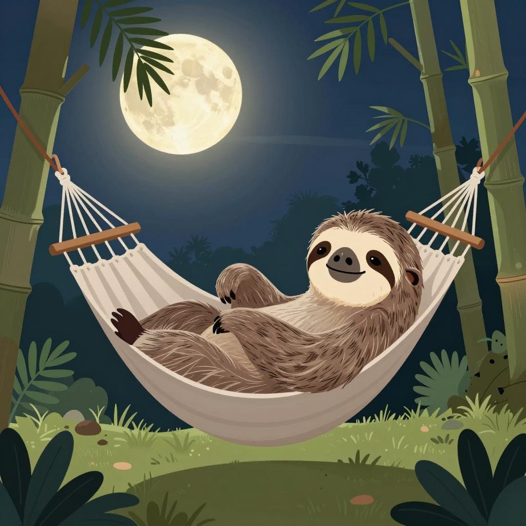 A charming digital illustration of a content sloth relaxing in a hammock amidst tropical foliage and bamboo trees. The backdrop features a full moon and gentle night sky elements, creating a peaceful and calming atmosphere.