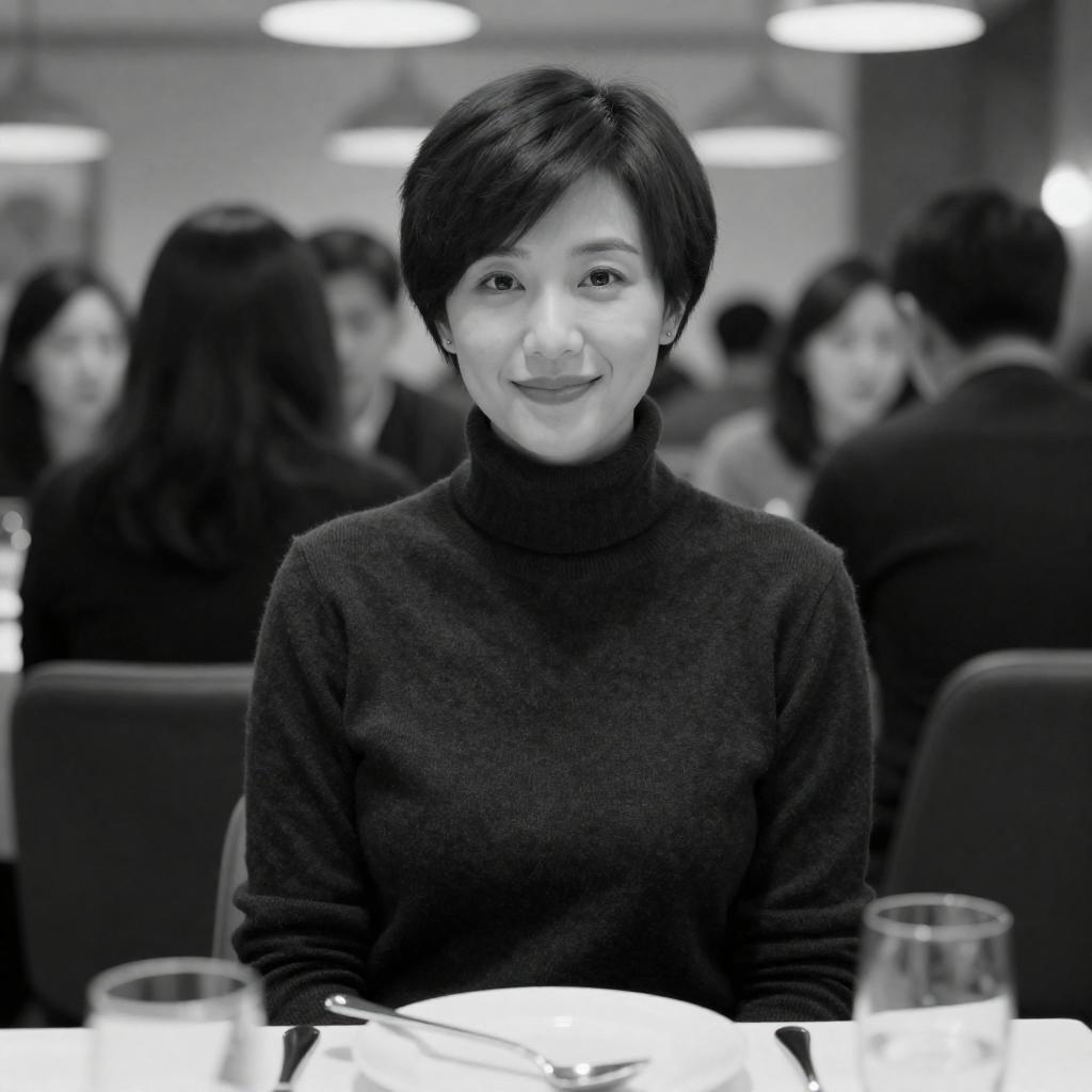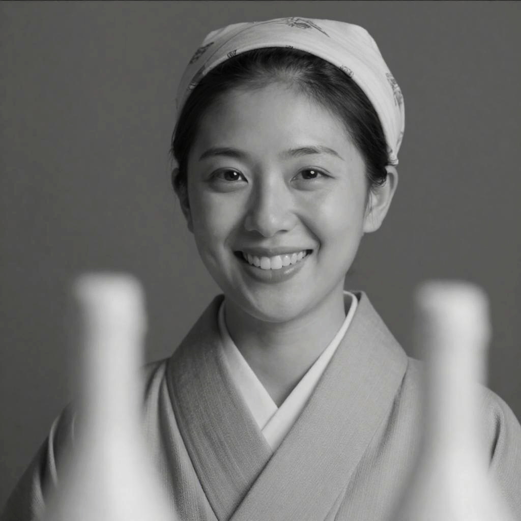 Black and white photograph of a smiling East Asian woman with a headscarf, wearing a traditional kimono. Her mouth is open, showing teeth. Two blurred white shapes are in the foreground. Plain background. Close-up portrait.