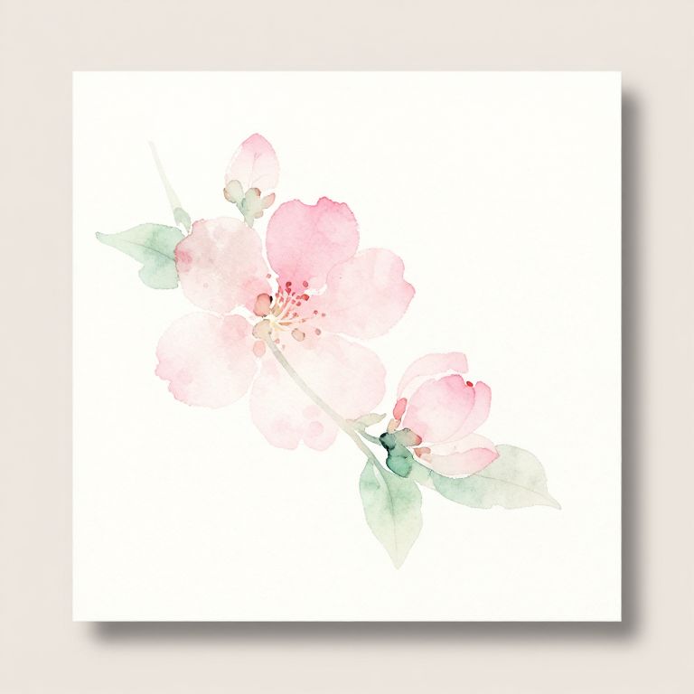 Images of art presenting delicate watercolor florals and nature scenes with soft gradients and gentle brushstrokes, accented by natural light filtering through a studio window, evoking tranquility and elegance.