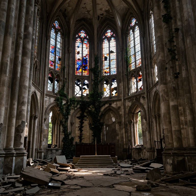Desolately ruined cathedral interior, shattered stained glass letting in fragmented light, dusty stones and rubble on cracked floor, creeping ivy inside ancient walls, muted warm and cold color mix, somber and reflective mood, high-resolution decay details