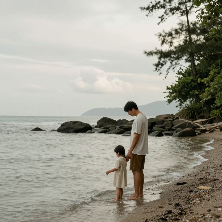 Serenity washes over the senses as two figures bask in the gentle embrace of a secluded shoreline, their presence a quiet testament to the enduring bond of family and the timeless allure of nature’s embrace.