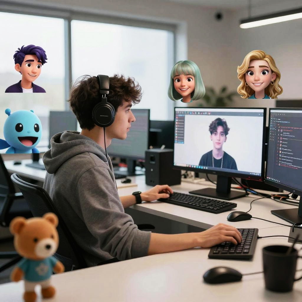 Average Discord moderator managing a chaotic chat room, surrounded by diverse avatars, modern office environment, daylight streaming through windows, semi-realistic style, energetic yet composed