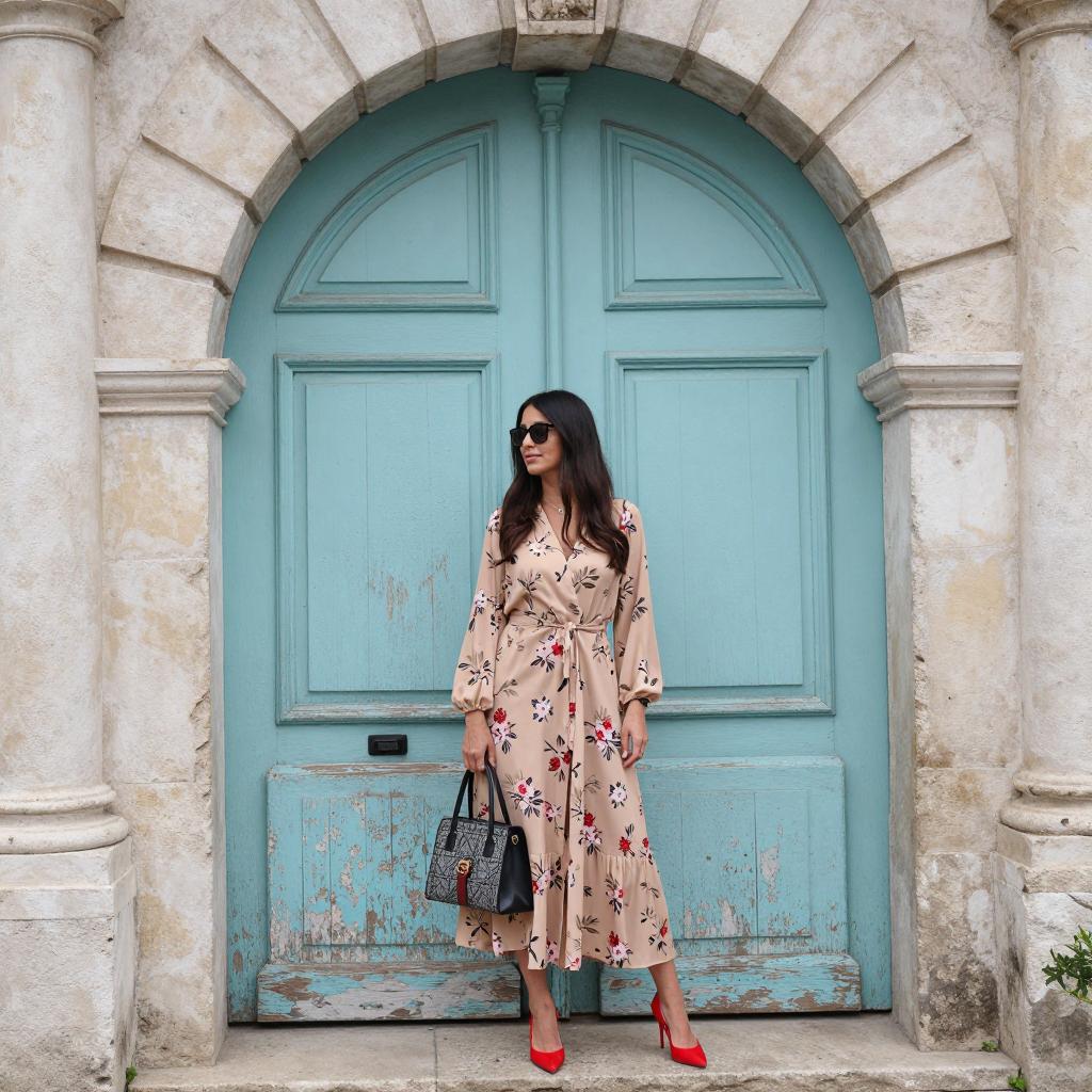 Photograph of a woman with fair skin and blonde hair, wearing a wide-brimmed straw hat, blue and white striped dress with a high slit, white high heels, and dark sunglasses. She sits on stone steps, right hand adjusting hat, left hand touching chin. Large beige woven bag on the ground to her right. Bright blue weathered door background. Intense red lipstick.