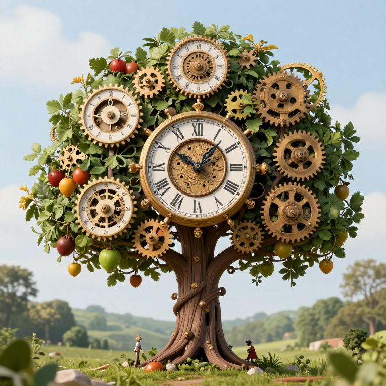 Where nature and invention entwine, this clockwork tree hums a symphony of time and life, its gears and fruit whispering the eternal dance of creation and decay.
