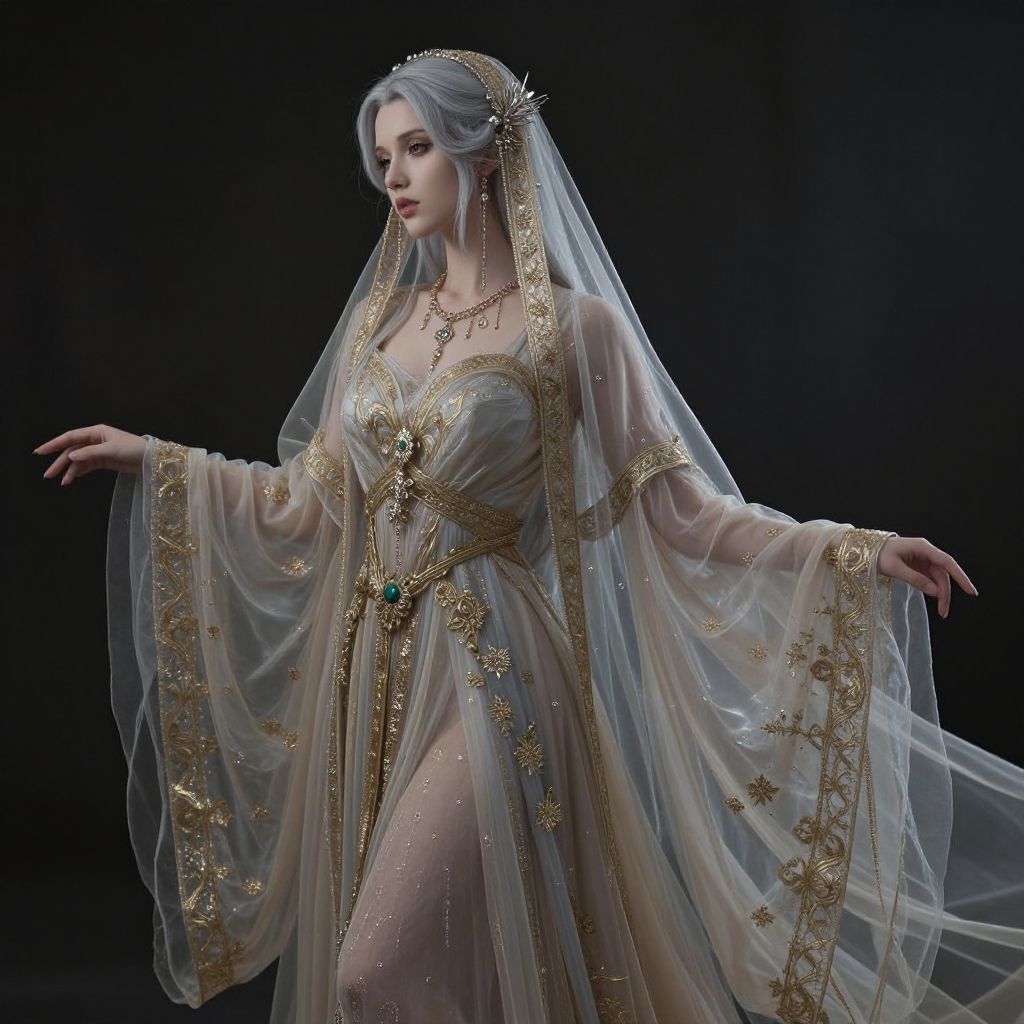 A fantasy portrayal of an ethereal enchantress with silver hair, dressed in a flowing gown richly embroidered with gold details and layered sheer veils. She features an elegant elongated neck, delicate veil revealing her collarbone, and wears exquisite matching jewelry. The composition highlights a graceful pose and serene elegance with muted, ultra-detailed colors against a dark, mystic background.
