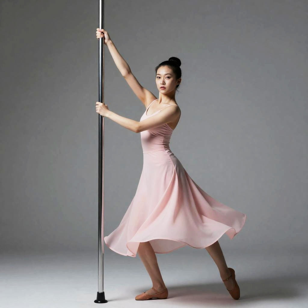 Young Asian woman performing swing dance fashion pose while holding a metal pole. She is wearing a flowing pink sleeveless dress and ballet flats, captured against a plain grey background. Her hair is styled in a neat bun, and she strikes an elegant dance posture.