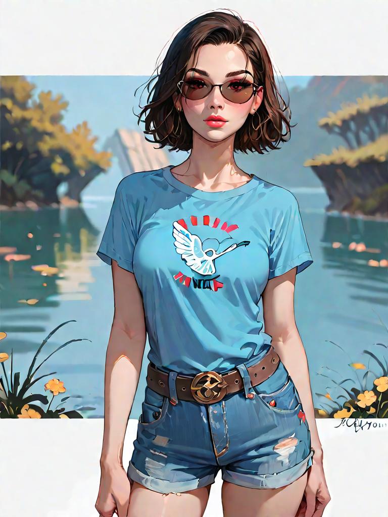 1girl, source_comics, realistic face, full body shot, Woman, casual, navy blue crew-neck T-shirt with a small white graphic on the left chest area, cutoff denim shorts with frayed hems and a light wash, brown leather belt with a square buckle, sunglasses with oversized round frames.