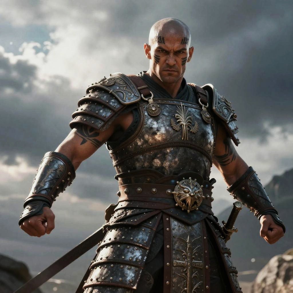 Bald photo of a fierce warrior with bald head and tribal tattoos, wearing ancient armor, dramatic cloudy sky background, epic fantasy style, powerful stance, realistic textures and cinematic lighting