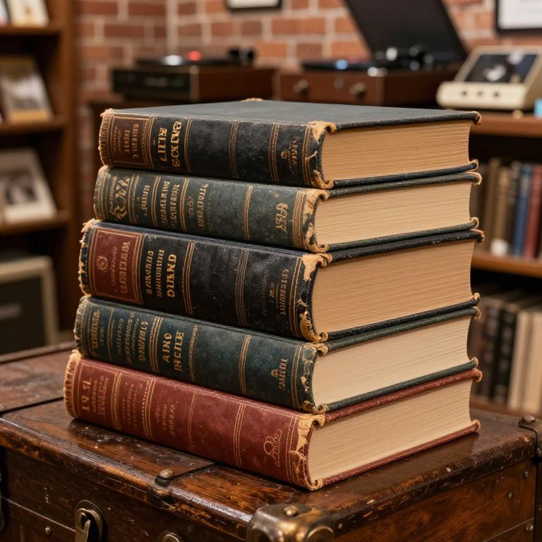 A close-up of a stacked vintage book collection on an old oak chest, each book having a distressed, layered cover with faded gold lettering, set in a vintage bookstore with exposed brick walls and vintage record players in the background, warm ambient lighting, authentic photo-realistic style