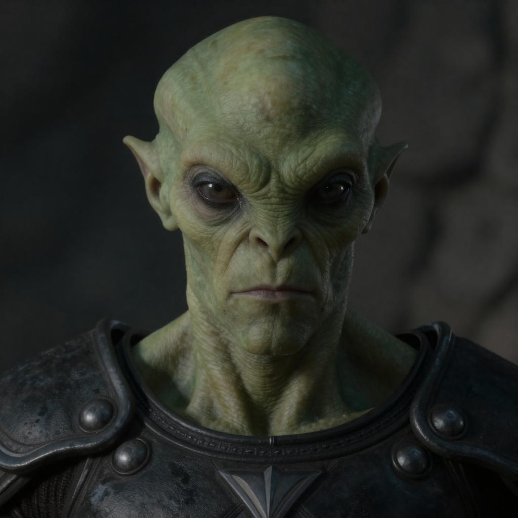Digital drawing of a green-skinned, bald, muscular humanoid with pointed ears, wearing a purple and gold outfit, covering his glowing yellow eyes with his hand. Background shows a stone building and dark, blurred structures. One hand extended forward. Intense expression.