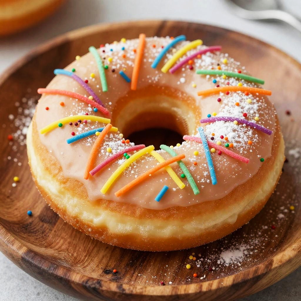 A close-up photograph of a glazed donut adorned with colorful sprinkles and powdered sugar. The donut has a shiny, light brown glaze and is topped with multicolored sprinkles, including red, blue, yellow, and green. It sits on a rustic, round wooden board, with a slight blur in the background. The glaze is smooth and slightly reflective, contrasting with the textured wooden surface. The sprinkles are evenly distributed, adding a playful, vibrant touch to the donut's appearance. The overall composition highlights the donut's appeal and texture.