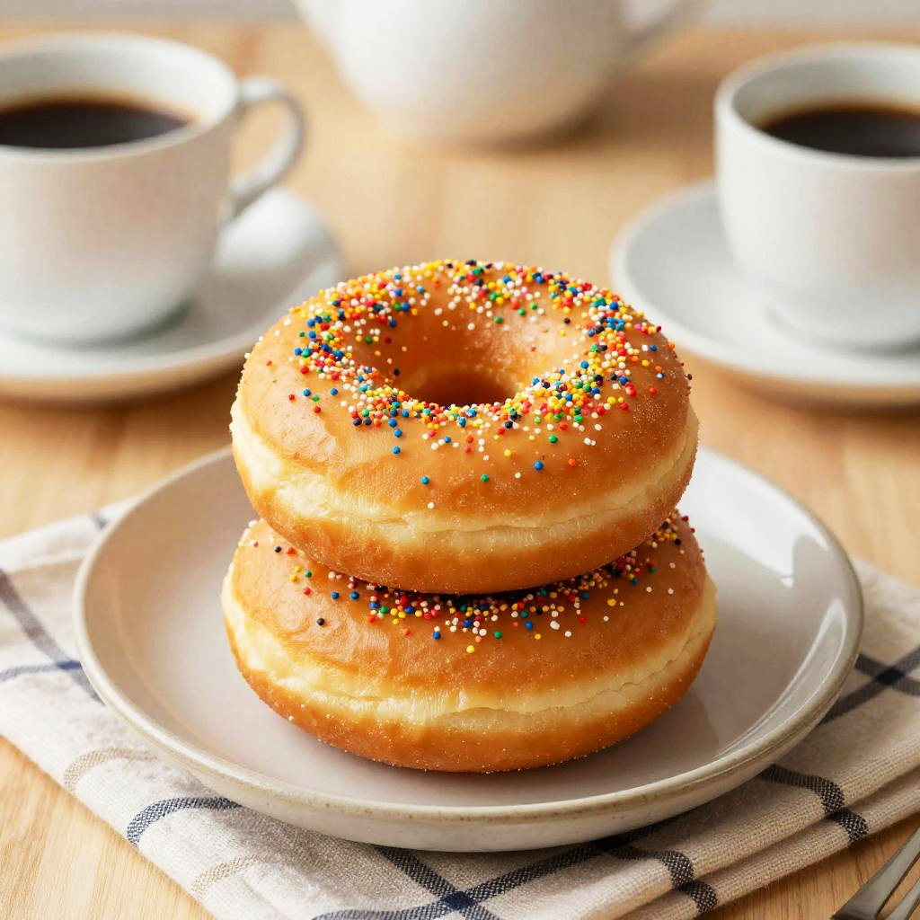 Vermicelli donut with golden crispy edges, topped with brightly colored vermicelli strands, soft and fluffy inside, placed on a rustic wooden plate with scattered sprinkles and powdered sugar, soft natural lighting, high detail food photography.