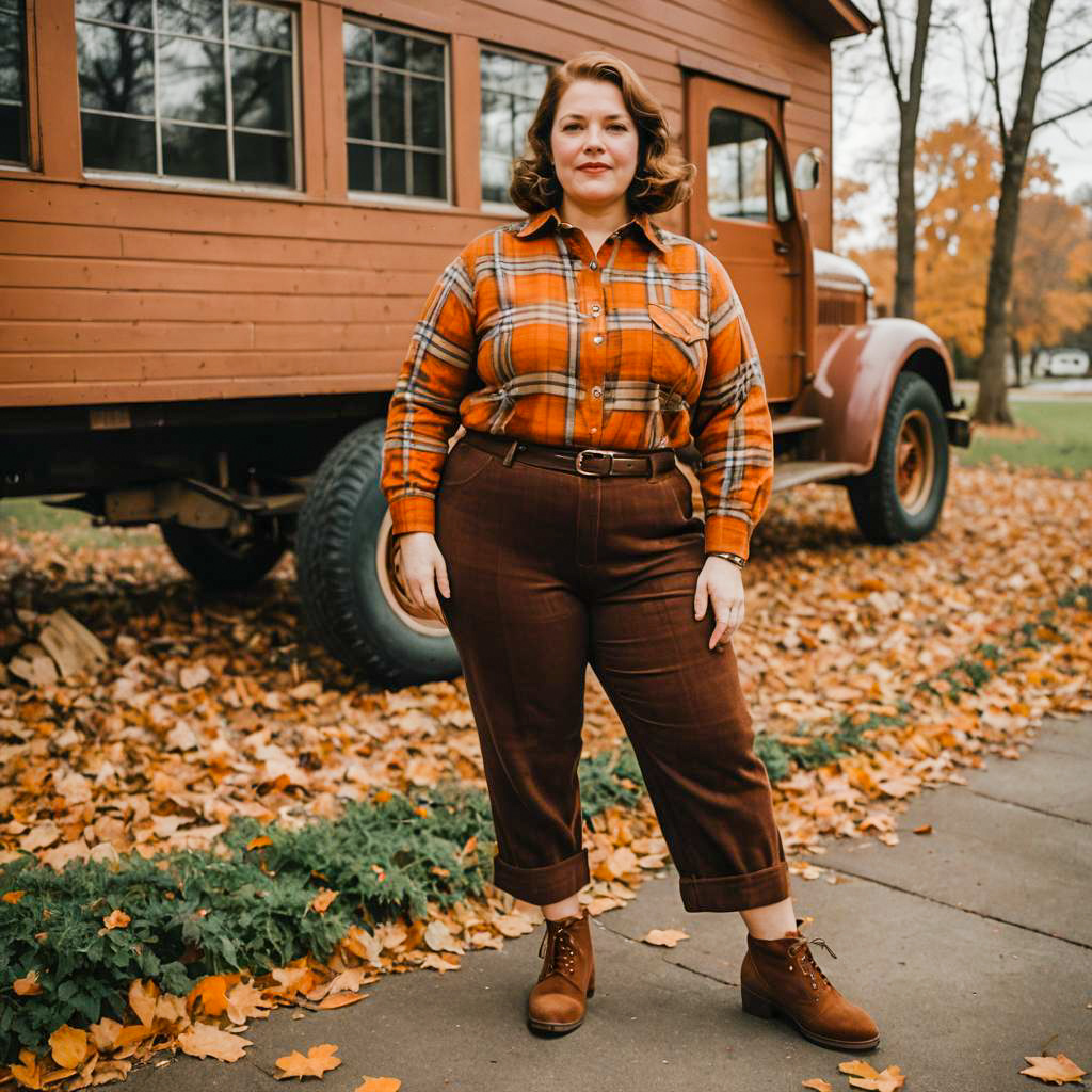 Photo of a thick thighs woman, finger waves, thanksgiving outfit, plaid flannel shirt with corduroy pants and ankle boots, burnt orange wool blend, eastman llp film stock