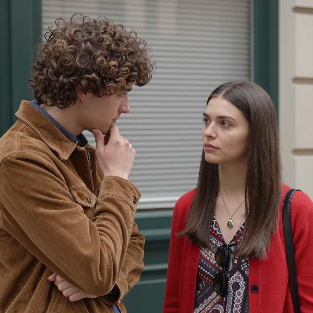 Two people in a warmly lit room. A woman with shoulder-length, wavy brown hair, wearing a checkered shirt, stands on the left. A young man with short, dark brown hair, wearing a maroon t-shirt, holds a blanket across his lap, sitting on the right. They face each other, engaged in conversation. The background includes a lit lamp and blurred household items.