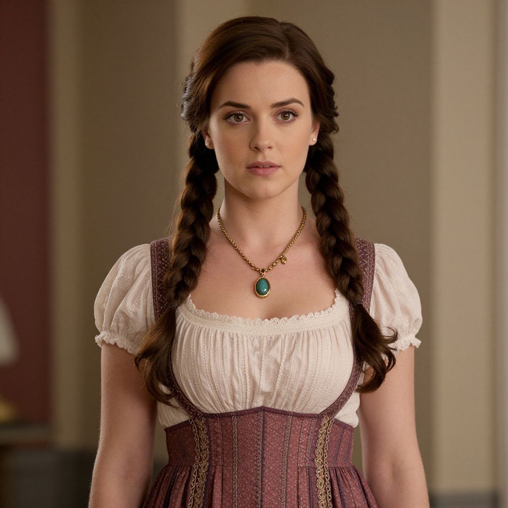 Photograph of a young woman with fair skin and brown hair styled in two braids. She has blue eyes and wears a sleeveless, royal blue dress with white lace trim along the neckline. Around her neck is a black beaded necklace with a green, oval-shaped pendant. She also wears matching earrings. The background is blurred, with warm, indoor lighting. The image has a high-contrast, slightly surreal style with vivid colors and sharp details. Her expression is neutral, and she gazes slightly to the side.