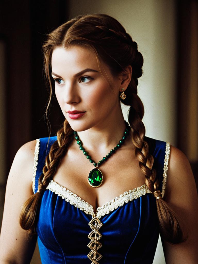 Lady tremaine costume plus, 1girl, solo, dress, brown hair, jewelry, necklace, realistic, braid, breasts, twin braids