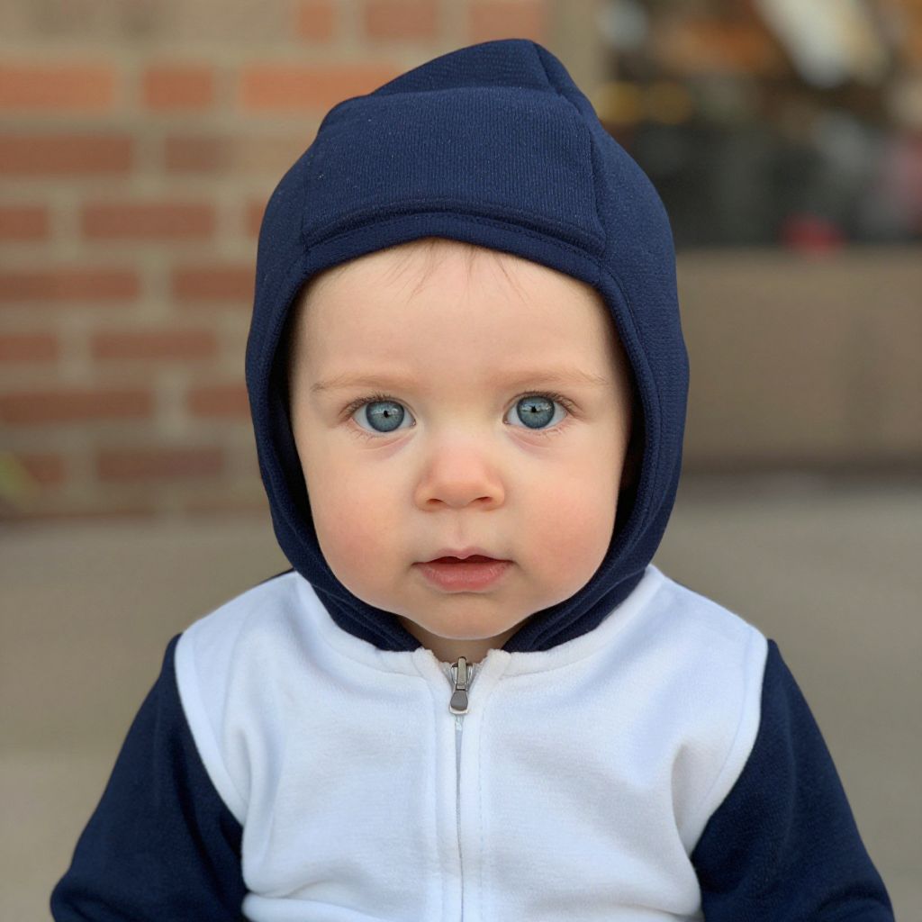 Photograph of a toddler with fair skin and blue eyes, wearing a navy blue hooded jacket with white sleeves, against a blurred brick wall background.