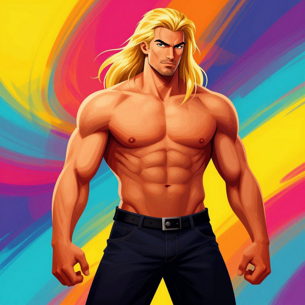 A digitally illustrated muscular man with long blonde hair stands confidently against a vibrant, abstract background filled with bold, swirling colors. The artwork highlights his defined physique with stylized shading and a dynamic pose, blending realism with a vivid, graphic art style.