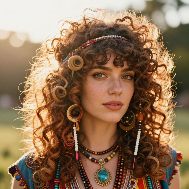 Portrait of a person with vibrant hippie curly hair adorned with headbands and bead accessories, styled into voluminous spirals, set in a free-spirited outdoor setting with sun flare, emphasizing organic texture and nostalgic 70s-inspired fashion.